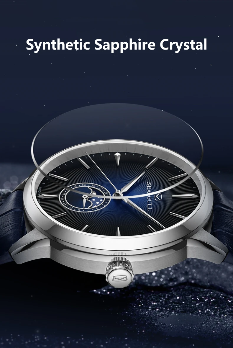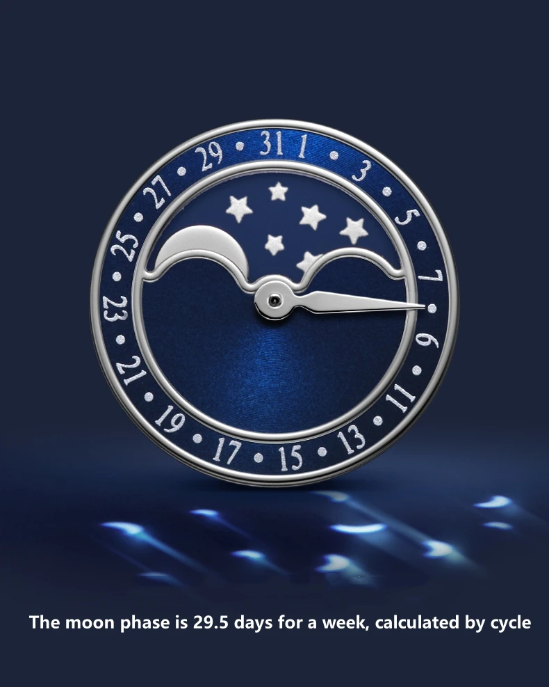 Die Uhr verfügt über eine Mondphasenanzeige und eine vollständige Kalenderfunktion, die sowohl praktischen Nutzen als auch visuelle Eleganz bietet. Eingefasst in robustem 316L-Edelstahl und geschützt durch kratzfestes Saphirglas, ist sie für langfristige Leistung und Haltbarkeit gebaut.