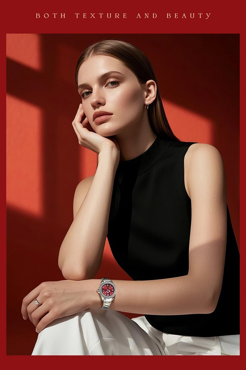 Angetrieben von einem zuverlässigen Quarzwerk sorgt die Uhr für präzise und konstante Zeitmessung bei minimalem Wartungsaufwand. Das robuste Edelstahlgehäuse und -armband bieten langlebigen Tragekomfort, während der verdeckte Druckknopfverschluss einen sicheren und nahtlosen Sitz gewährleistet.