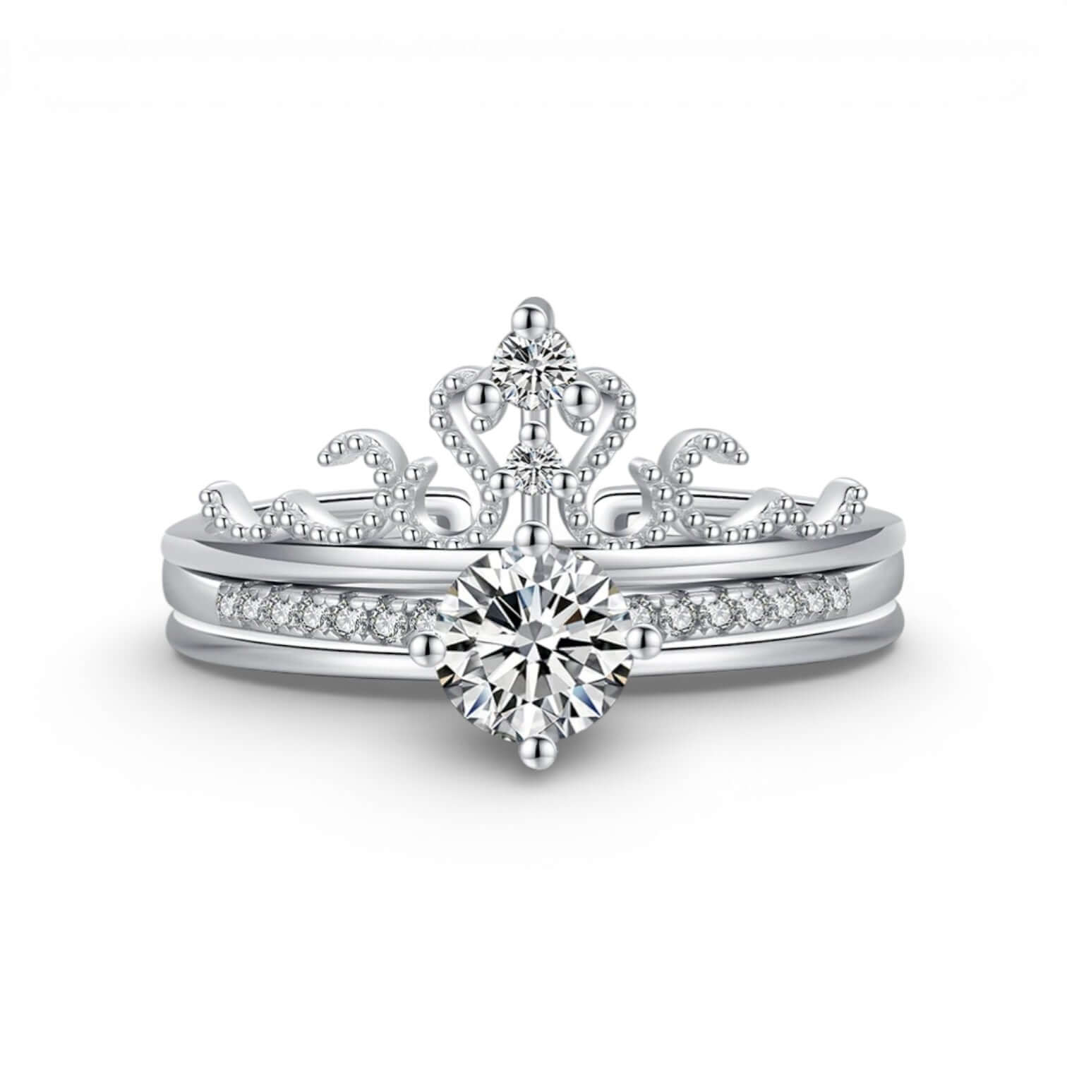 Elegantes Braut-Ring-Set aus 925er Sterlingsilber mit einem Zirkon-Hauptstein und Kristall-Seitensteinen. Verfügt über ein raffiniertes, kronenförmiges Design mit Krappenfassung. Mit einem... Lesen Sie mehr