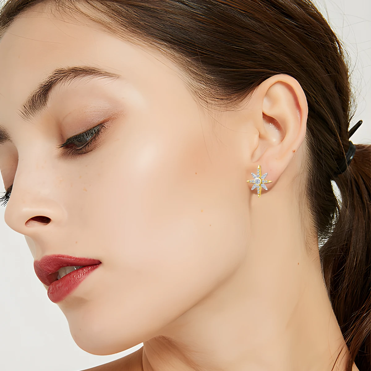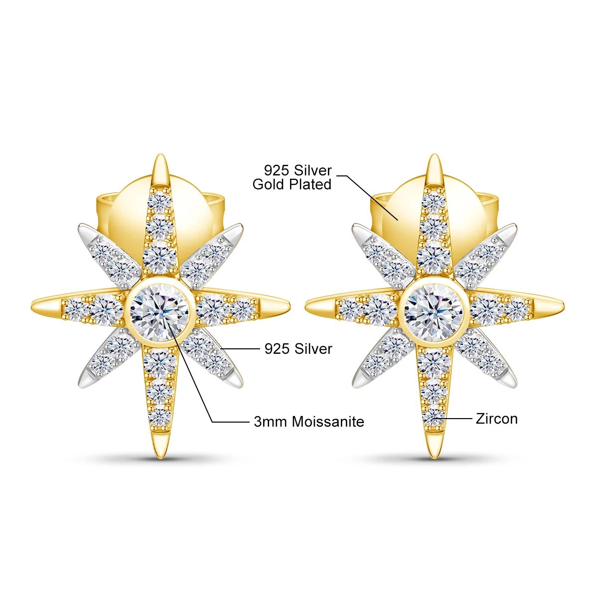 These 18K gold-plated moissanite stud earrings combine timeless elegance with modern luxury. Crafted from 925 sterling silver and finished in your choice of white, yellow, or rose gold plating, each pair features a certified 3mm moissanite stone (0.1ct) with D color and VVS1 clarity—delivering exceptional sparkle and brilliance that rivals diamonds. The starburst design captures light beautifully, making these studs perfect for everyday wear or special occasions. Hypoallergenic and antioxidant properties ensure lasting comfort and durability for sensitive skin. Each pair arrives in an exquisite gift box with a GRA certificate and weighs approximately 2.5g for a refined, wearable presence. Ideal as an anniversary, birthday, mother's day, or wedding gift, these versatile earrings suit any woman or girl. Customization and wholesale options are available upon request.